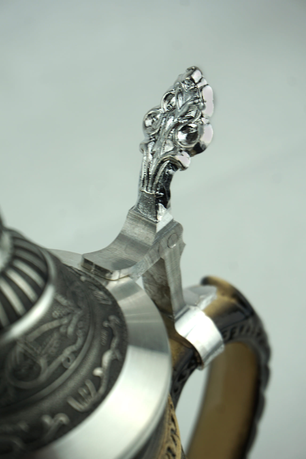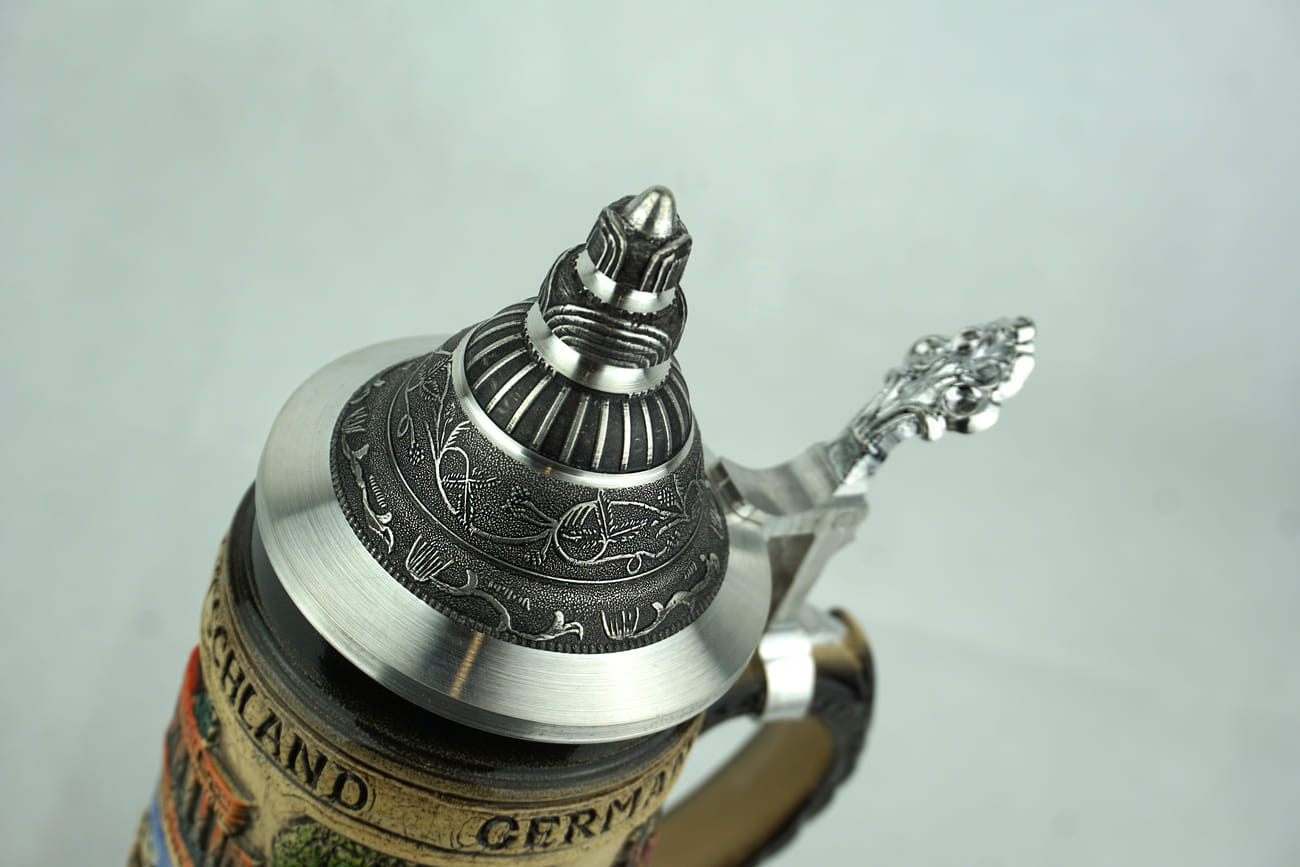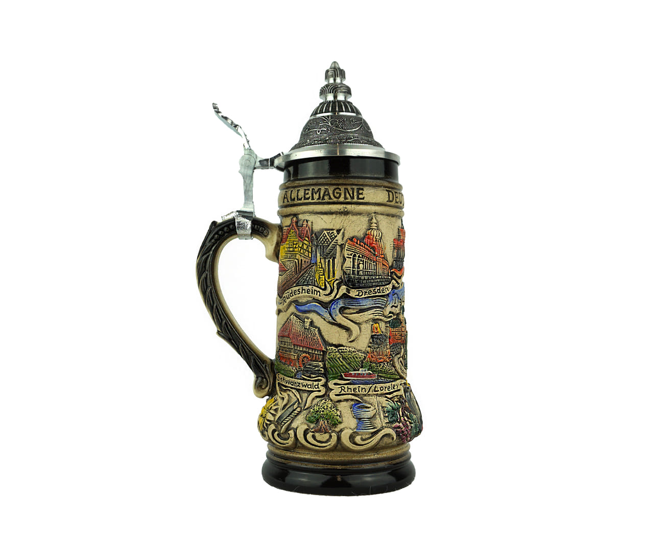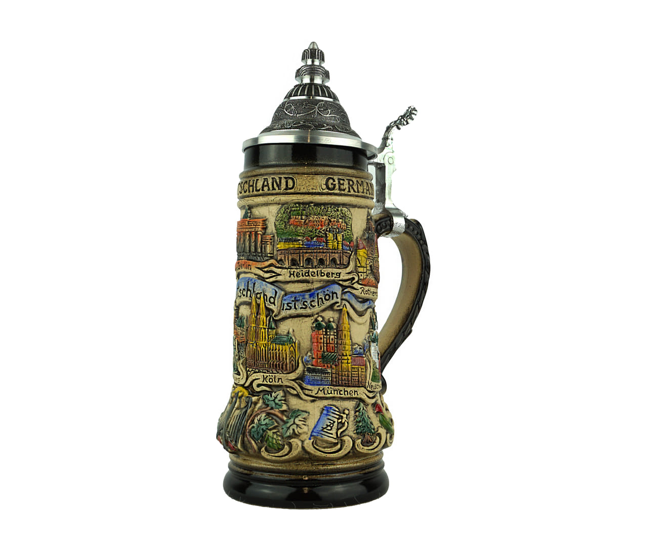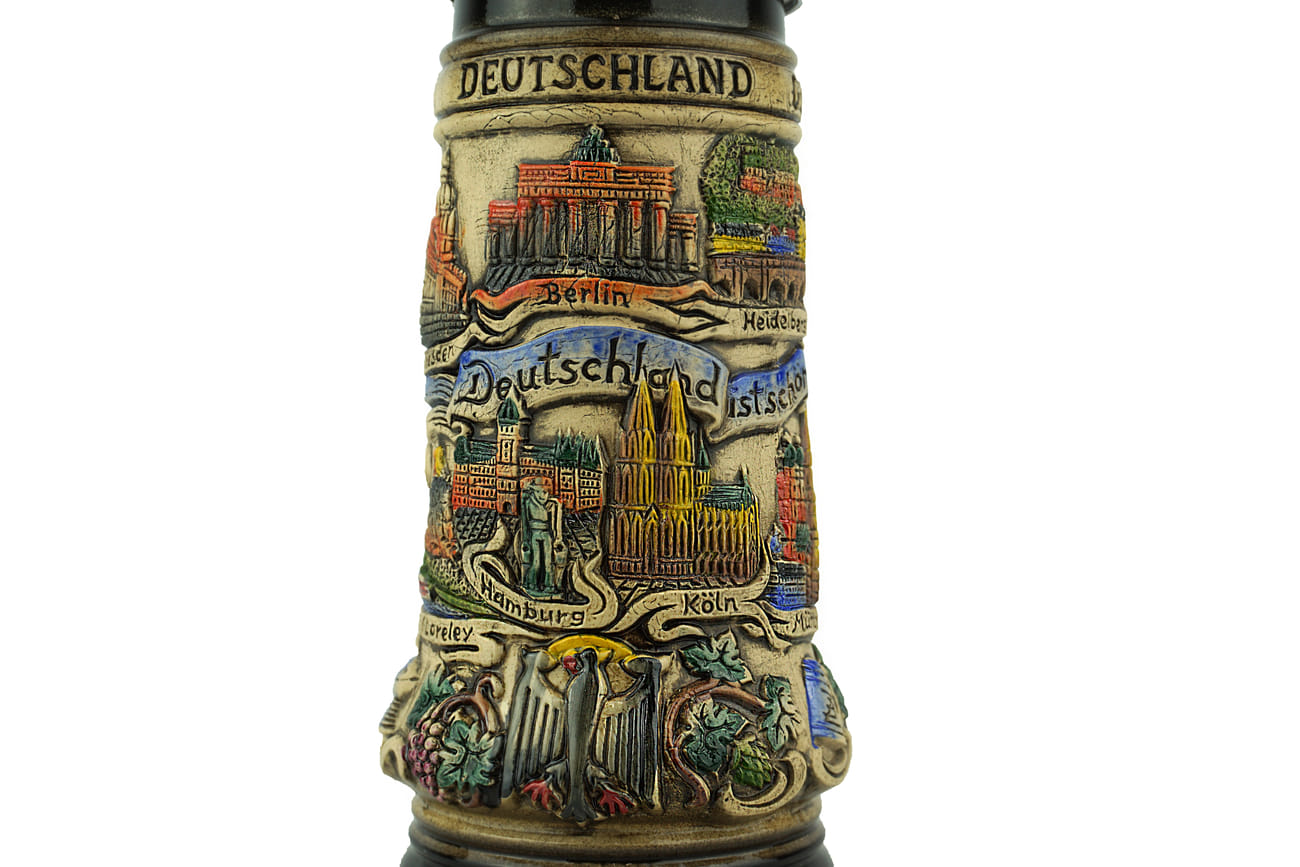 This stein has a light glaze and features many colorful landmarks of German cities. In the lower area of the beer stein, the main ornament is the German crest, while around it more motifs, such as vine leaves, grapes, a beer stein, and a pine tree can be found. This beer stein is limited edition and is individually numbered by the painter (5,000 of them worldwide). Certificate of authenticity included.
