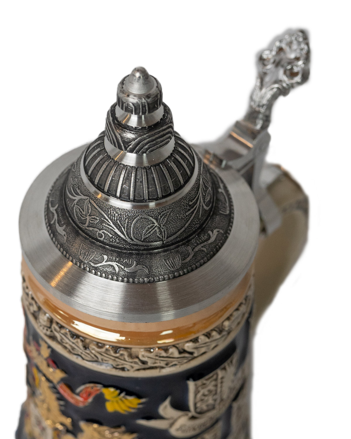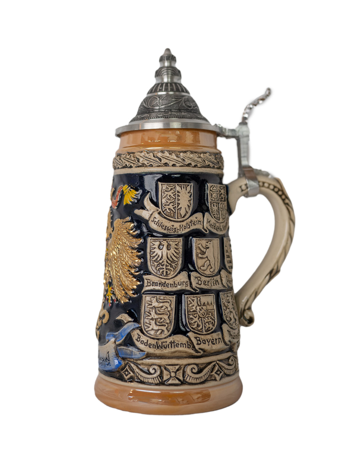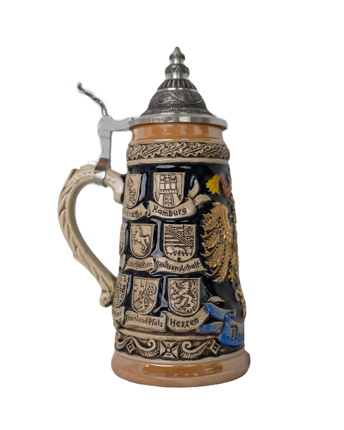 This beer stein is decorated with the symbolic German eagle. Its sides are decorated with the 16 crests of the German states, also known as "Bundesländer."