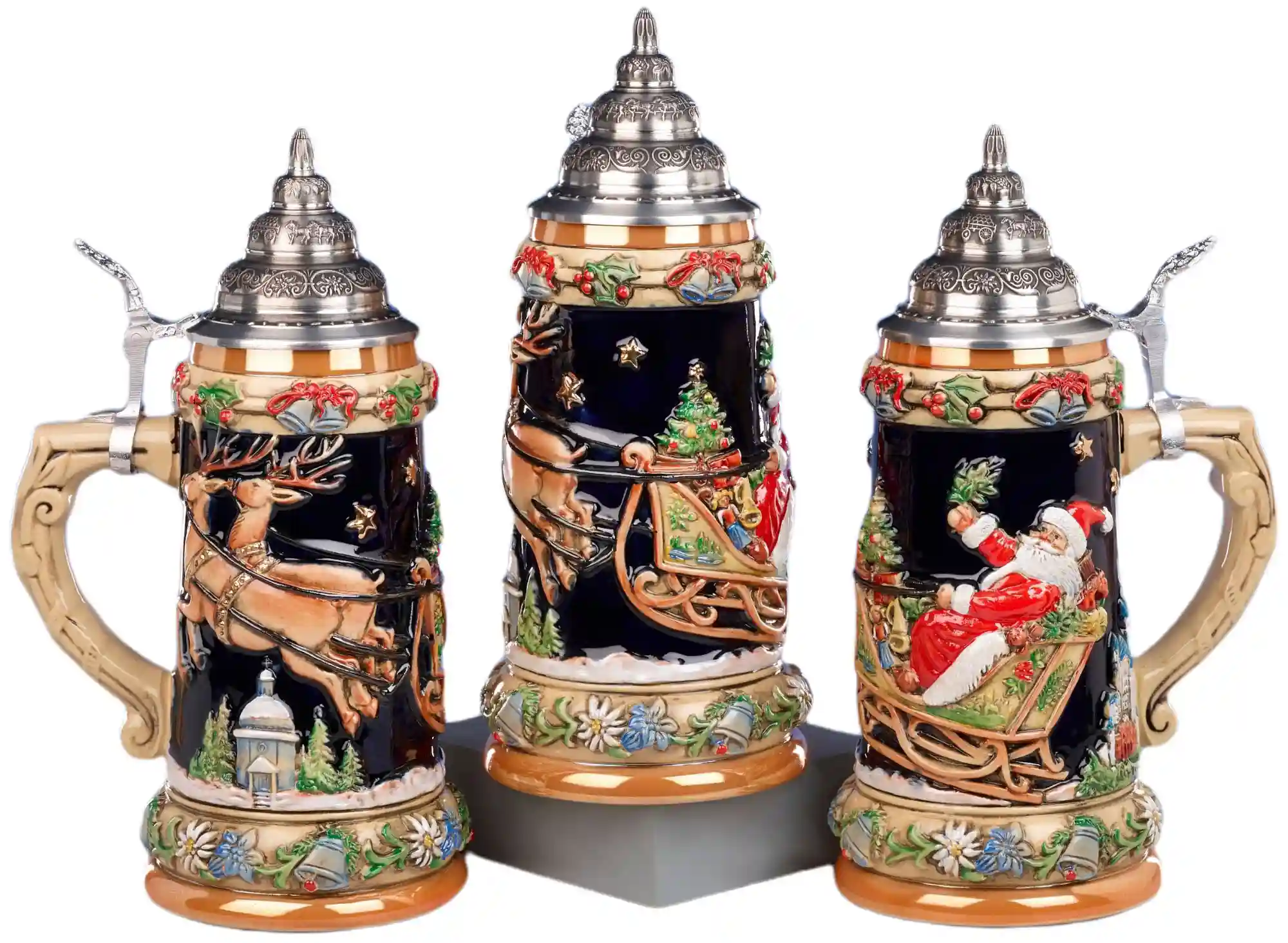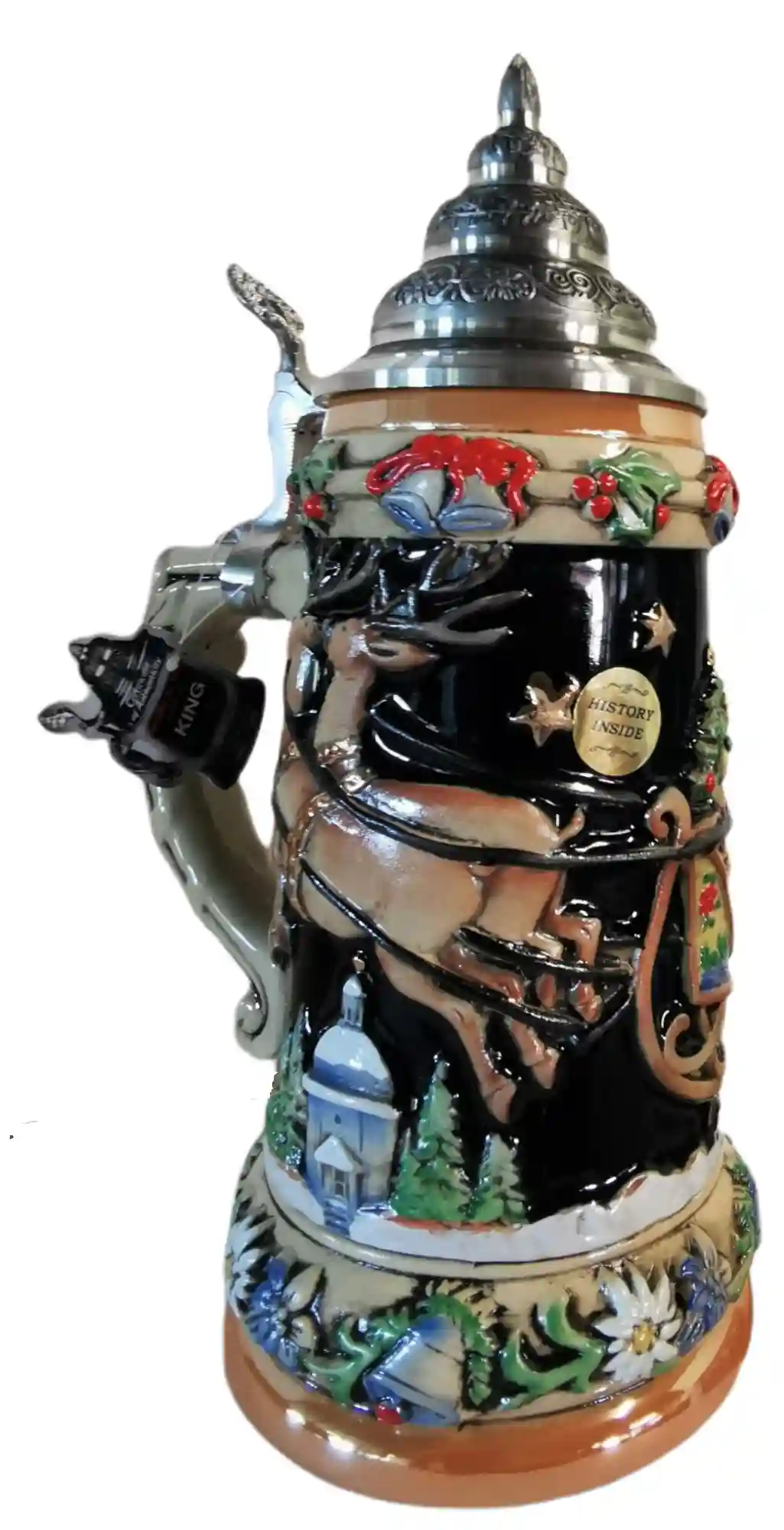 This beautifully detailed relief stein shows Santa sitting in his sleigh fully loaded with all kinds of toys. The open front door invites him to enter and leave some gifts. Besides the hand-crafted relief and he hand-panting, the 24k cherubs on the handle are additional highlights to this stein. A lid made of genuine pewter crowns this beautiful sein. Limited edition of world-wide 10,000 pieces. Each stein is individually numbered and comes with a certificate of authenticity.