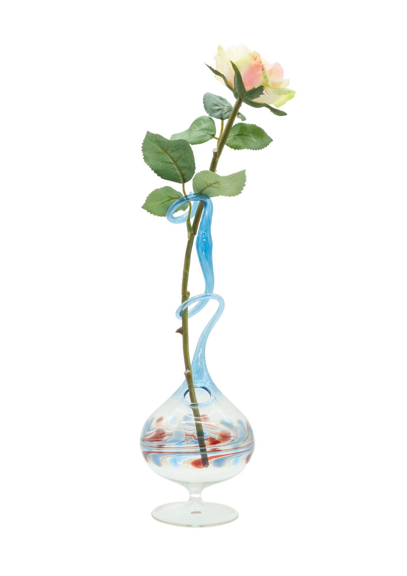 Gift yourself or a loved one this glassblower's creation—a work of art that not only holds a delicate bloom but elevates it to a realm of unparalleled artistry. Let the singular beauty of a lone rose find its perfect complement in this hand-crafted masterpiece, where the union of nature and craftsmanship unfolds in a harmonious ballet of elegance and grace.